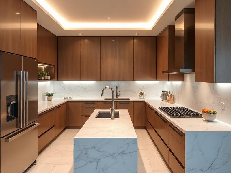 High-End-Küchenrenovierung mit italienischem Marmor, Premium-Geräten und maßgefertigten Schränken.