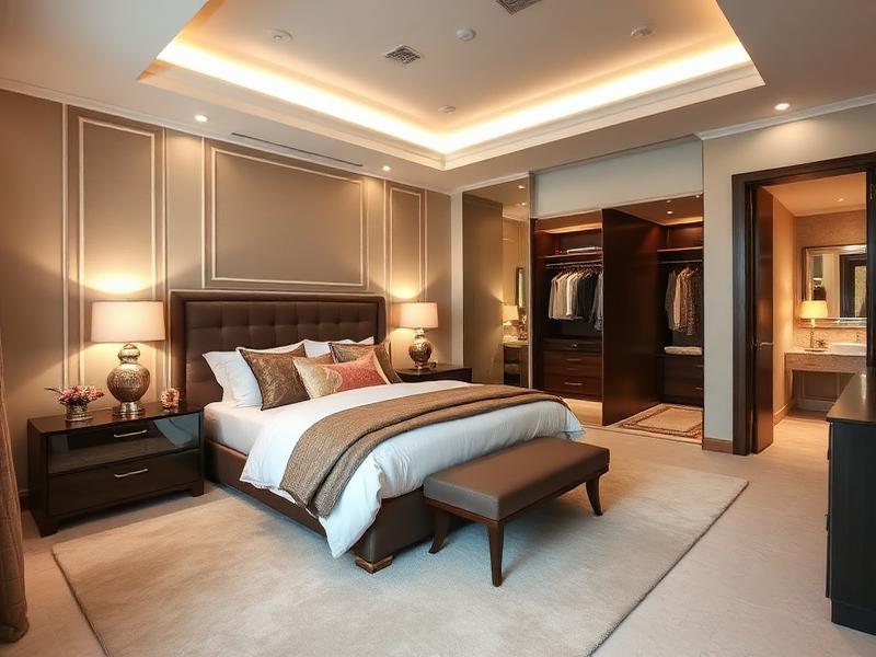 Elegantes Hauptschlafzimmer mit begehbarem Kleiderschrank und Spa-inspiriertem Ensuite-Badezimmer.